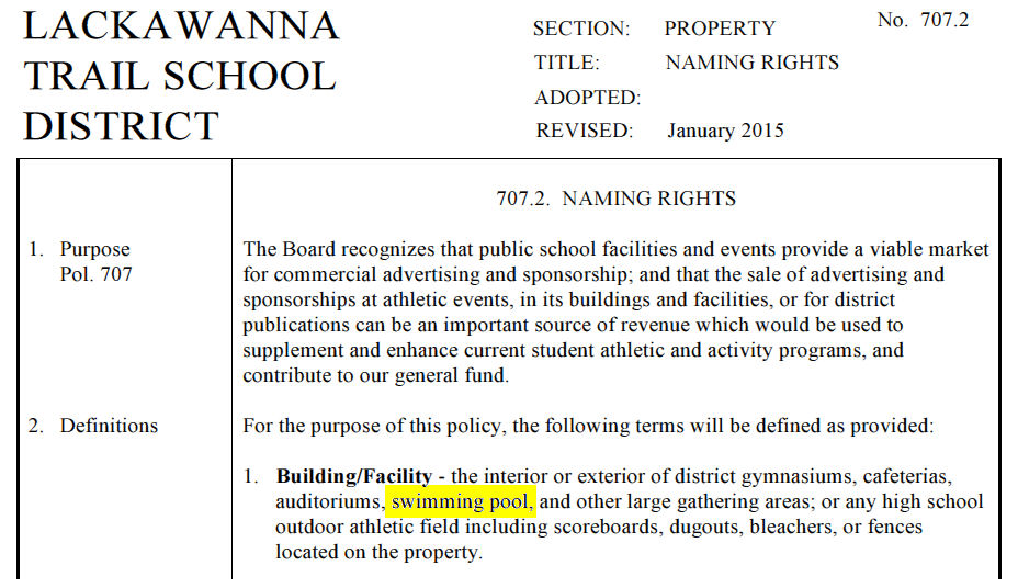 NOTE: The District's Naming Rights policy #707.2, mentions the Swimming Pool.